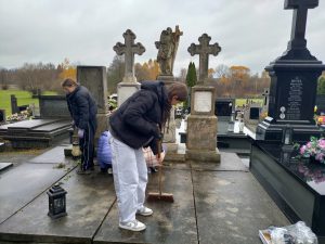 Właśnie po to 29 października cmentarz parafialny w Oleksinie odwiedzili nasi uczniowie pod opieką nauczycieli i pana dyrektora. Oczyścili grobowiec rodziny Suchodolskich, gdzie spoczywa patron naszej szkoły, złożyli kwiaty, zapalili znicze. Potem przyszła kolej na groby nieznanych żołnierzy oraz grób pana Wiktora Zięby – dawnego dyrektora szkoły w Bojmiu – i pani Anieli Miernickiej – wybitnej pedagog, jaka uczyła przed laty w naszej szkole.