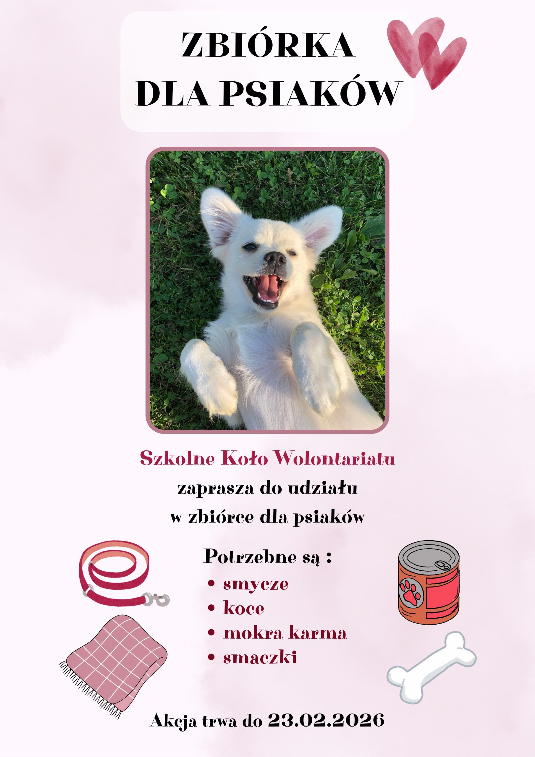 Szkolne Koło Wolontariatu zaprasza do udziału w zbiórce w naszej szkole dla psów do adopcji – oczyszczalnia Kałuszyn. Akcja trwa do 23.02.2026r. Co można przynieść: mokrą karmę, koce, ręczniki, smycze, smaczki 🐶❤️‍🩹