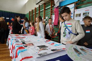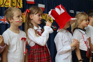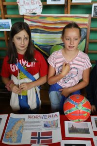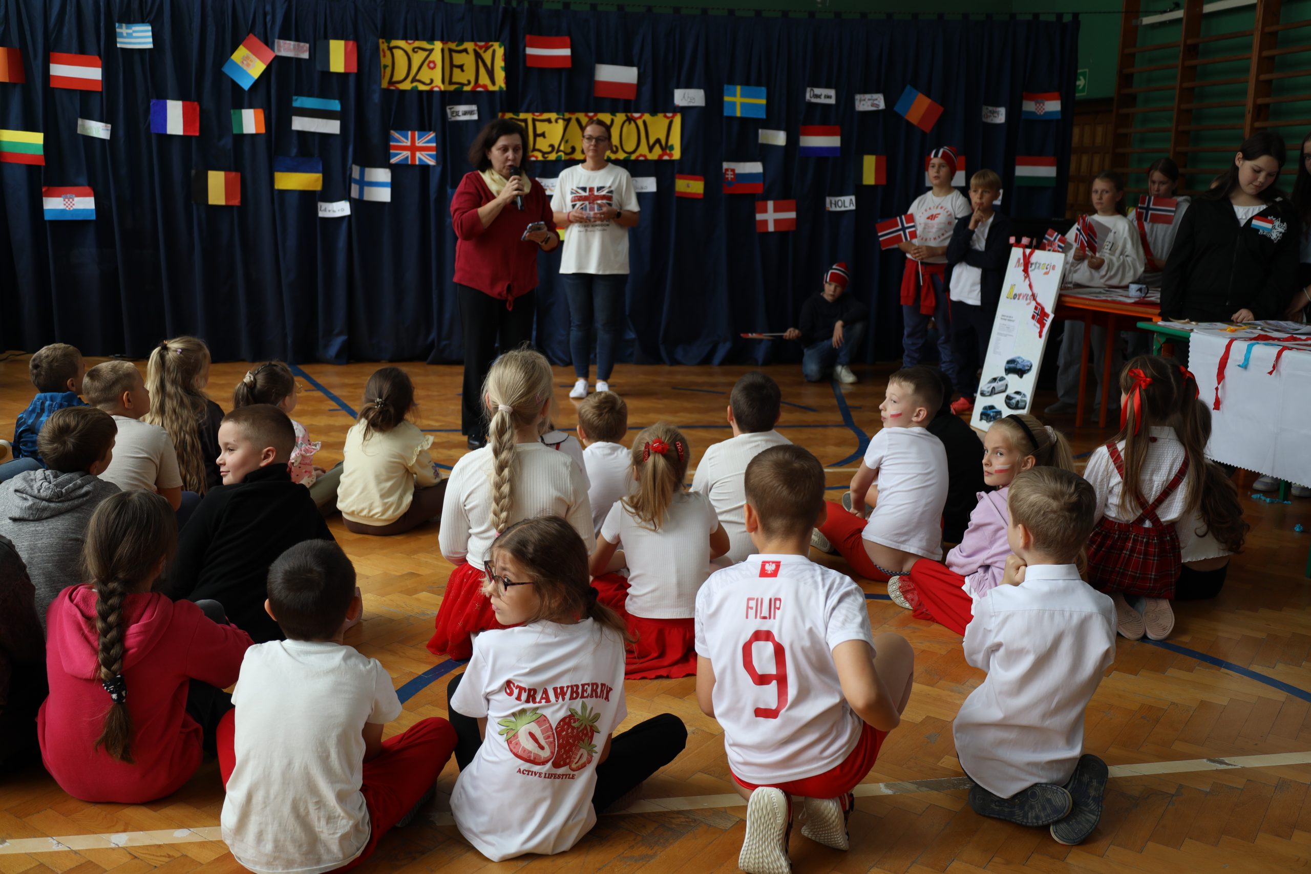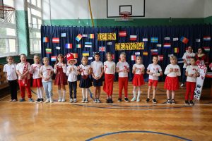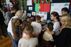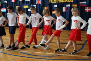 Uroczystość rozpoczęła się na początku czwartej godziny lekcyjnej. Młodsze dzieci z klas I-III wykonały piosenki z wybranych krajów, w tym z Polski, a niektóre pokazały także stroje nawiązujące do flag państwowych. Starszaki ochoczo uśmiechały się do oglądających zza stoisk Luksemburga, Portugalii, Niderlandów i Czech. Było bardzo gwarno i wesoło.